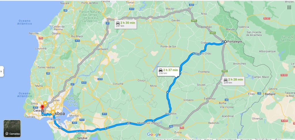 Mas nós decidimos ir mais para dentro do Alentejo profundo. Fomos de Lisboa a Portalegre pela A2 e A6, mas em Montemor-o-Novo cortámos para Arraiolos, porque queríamos visitar esta Vila, depois Estremoz que é uma cidade muito bonita para se visitar, mas não o fizemos desta vez. Cerca de 235 km, 2h53m. No regresso tomámos o IC13 em direção ao Crato, seguindo-se Alter do Chão, Avis e Pavia, Arraiolos, Montemor-o-Novo e tomámos a A6 e depois A2 em direção a Lisboa, 236 km, 2h37m.